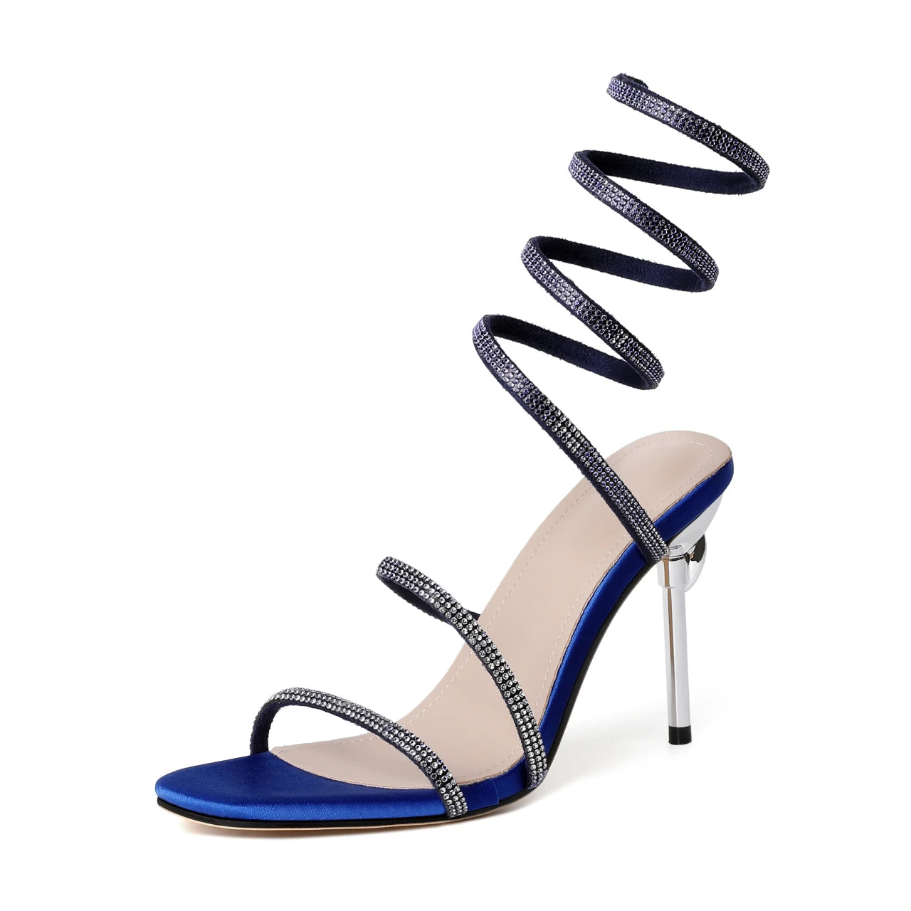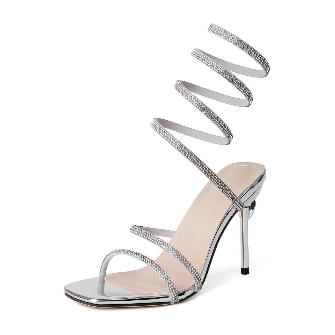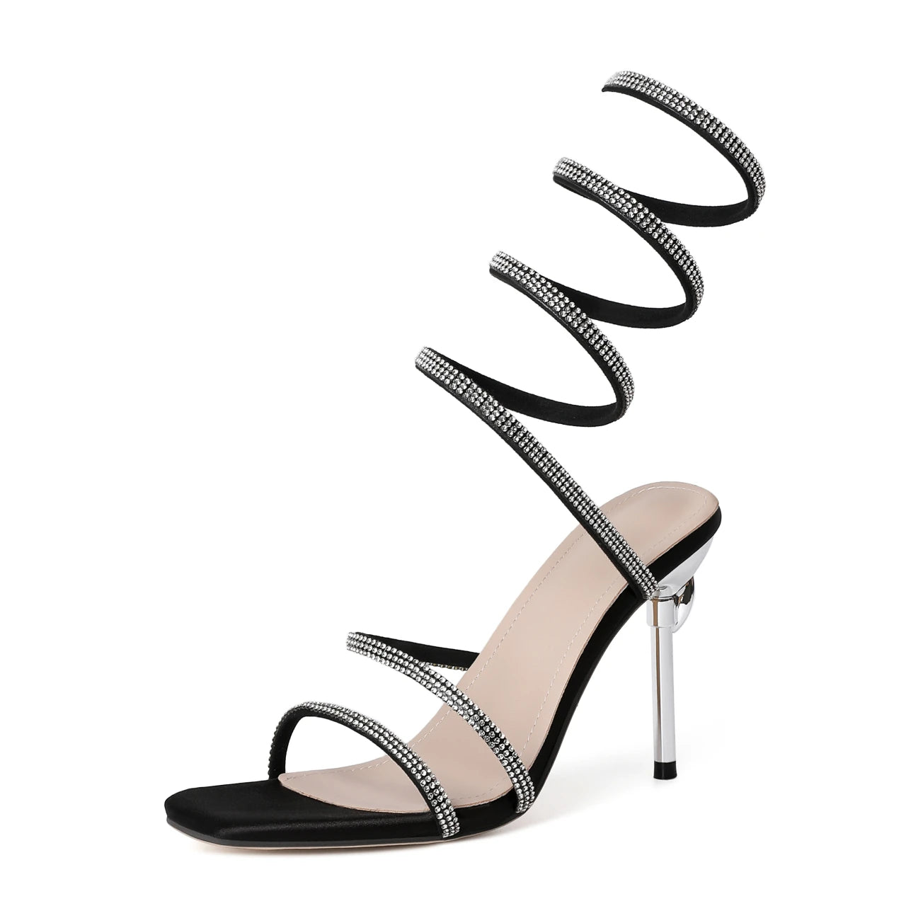 Ankle-Wrapped Two-Strap Stiletto Heel with Rhinestones and Snake-Shaped Open-Toe Sandals for Women