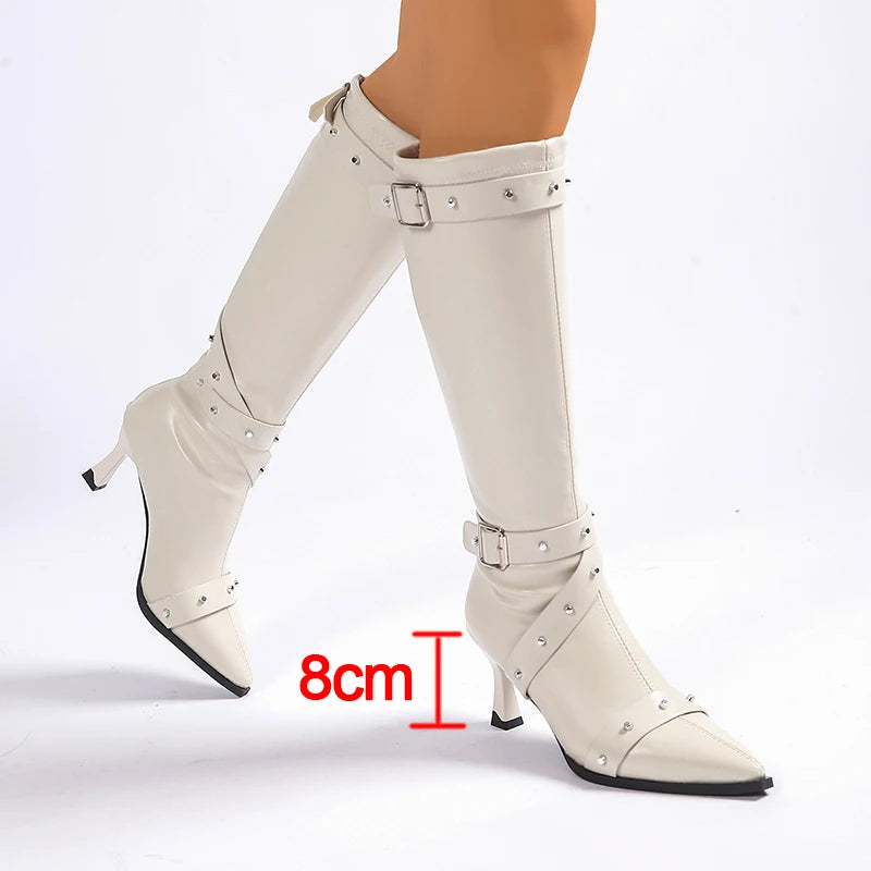 Fashion Stiletto High Heels Women Knee High Boots Sexy Point Toe Night Club Party Shoes Woman Rivet Buckle PU Leather Long Boots